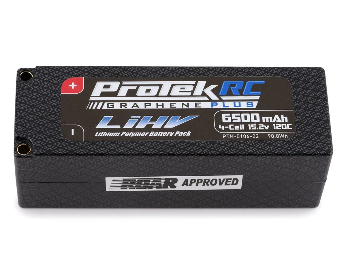 The ProTek R/C 4S 120C Graphene + HV 6500mAh LiPo Battery is a great battery option for anyone looking for a high capacity, high output 4S battery. Weighing 578 grams, the 4S HV is lighter than a standard 4S pack, with much higher capacity. This provides more runtime, and a dramatic increase in voltage and punch over the course of a run.Â
